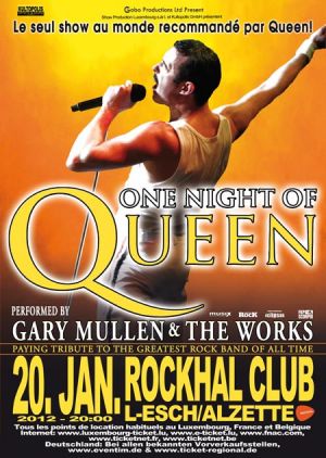 Gary Mullen & The Works treffen perfekt den charismatischen Sound ihrer Idole und stehen sowohl der stimmlichen als auch musikalischen Variation der Queen-Legende in Nichts nach. „One Night Of Queen“ lädt ein zu einer perfekten Illusion, einer Zeitreise in die Ära der britischen Mega-Rocker. In diesem zweistündigen Konzert werden die Hits eines Jahrhunderts wie ‚Bohemian Rhapsody’, ‚Don´t stop me now’ oder ‚We are the champions’ live auf die Bühne gebracht. Wenn Gary Mullen alias Freddie Mercury in Originaloutfits die Stimmung zum Kochen bringt, wird man das Gefühl nicht los, hier ein echtes Queen-Konzert zu erleben.